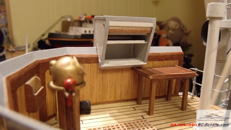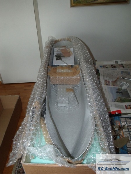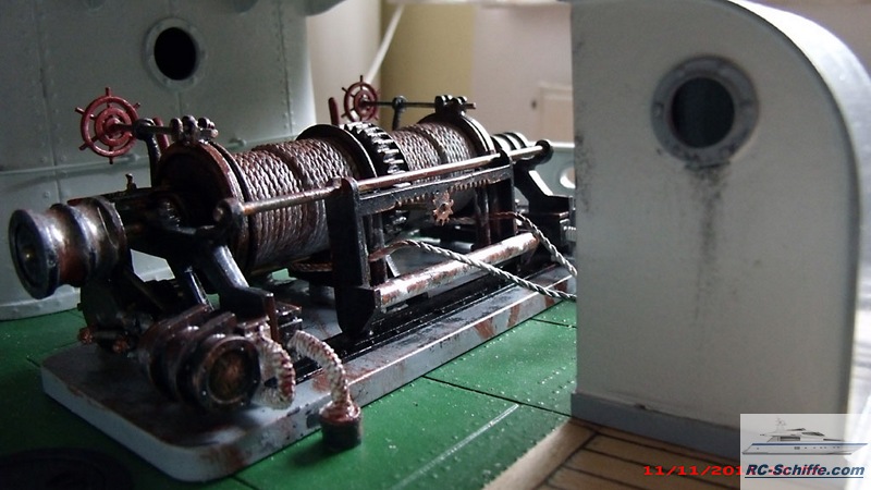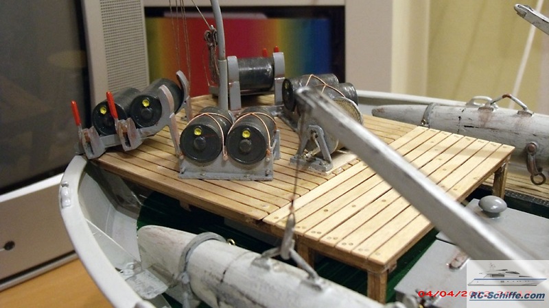 | Tipps für den Bau | Das Schiff der "Roundtable Clas" ist aus einem Englischen Baukasten entstanden "mountfleetmodels" Original 1942 in Dienst gestellt, nach WWII bis 1981 in der Hochseefischerrei. Der Rumpf und ein Teil des Deckshauses sowie der Schornstein ist aus GfK. Alle anderen Aufbauten, das Deck, und die Galgen sind aus Sperrholz 1 - 2mm und div. Leisten. Es sind weit mehr als 1350 Weismetall-Beschläge verbaut, der Schwerpunkt liegt daher sehr hoch, entsprechend ist es notwendig genügend Ballast tief im Rumpf zu verbauen. 7,5 Kg Batterien + 2,5 Kg Blei Gesamtgewicht ~20Kg Eine Transportkiste und ein "Bollerwagen" sorgen für einen sicheren Transport Mein Hochdachauto (Renault-Kangoo) macht es mir leicht. |
