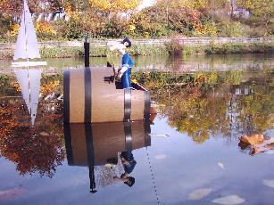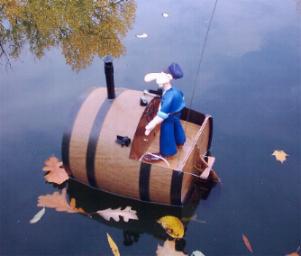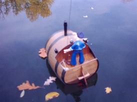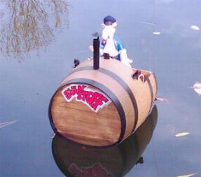 | Besonderheiten | Spaß im Schiffsmodellbau sollte schon sein! Wer kennt nicht Werner Beinhart aus den Filmen. Werner denkt sich immer etwas Besonderes aus und nun hat Werner gleich ein ganzes Fass an sich genommen! Schwimmfähig gemacht, kann er seinen Vorrat überall auf dem Wasser hinbringen. Die Idee: Werner die Figur habe ich vor zwei Jahren im Winter zusammen gebastelt. Und nun wollte ich auch einen fahrbaren Untersatz für Werner. In meiner Kindheit habe ich einen Zeichentrickfilm die Schatzinsel gesehen. Dort fuhr Kapitän Flint mit einem Fass auf dem Wasser. Für Werner wollte ich auch solch schwimmfähigen Untersatz bauen. Am Anfang wollte ich ein Segel drauf setzen und einen kleinen Hilfsantrieb nehmen. Aber dann entschied ich mich doch nur für einen Schraubenantrieb. der Kutter: Der Schwimmkörper des Bootes ist ein Fass aus Plaste. Solche Dinger hat man früher über ein 5 Liter Bierfass aus Blech gestülpt. Ein Tablett, wo rauf alles stand, Deckel und den Zapfhahn gab es auch dazu. Das Fass hat einen max. Durchmesser von 21 cm, ist 26 cm lang und wurde mit Deckel versehen. Diese sind aus Sperrholz, gebeizt und lackiert. Werner musste auch vernünftig stehen können und so schnitt ich einen Teil vom Fass heraus. Das Ruder ist ebenfalls aus Sperrholz und mit Messingbeschlägen versehen. Es sieht recht wuchtig aus, aber dadurch ist das Fass auch sehr gut steuerbar! Wichtig für die Stabilität ist der Kiel mit Bleigewicht. Dadurch ist auch eine sehr gute geradeaus Fahrt gewährleistet. Angetrieben wird das Fass über starre Welle mit Schiffsschraube von einem E-Motor der 600-ter Klasse. Dieser ist aber ein Langsamläufer, ähnlich dem Scale-E-Motoren. Ein Schornstein ziert ebenso, wie andere Kleinteile, das Fass! Rauchen sollte der Schornstein auch, aber diese Sache werde ich sicher erst später zum Funktionieren bringen. Zu den Kleinteilen gehören funktionsfähige Positionslaternen, Steuerrad, Handhupe und Enterdraggen. Sicherlich werden am Modell noch Verschönerungen und Änderungen vorgenommen. Ich habe z.B. den E-Motor gegen einen kleineren von VEB PREFO Dresden ausgetauscht. Den hatte ich noch in der Schublade liegen! Ein "Hinweisschild-Bölkstoff" ziert jetzt auch den Bug. Das Modell wurde nicht nach Bauplan gebaut, sondern nach einer Idee und so kann man doch seiner Phantasie freien Lauf lassen |