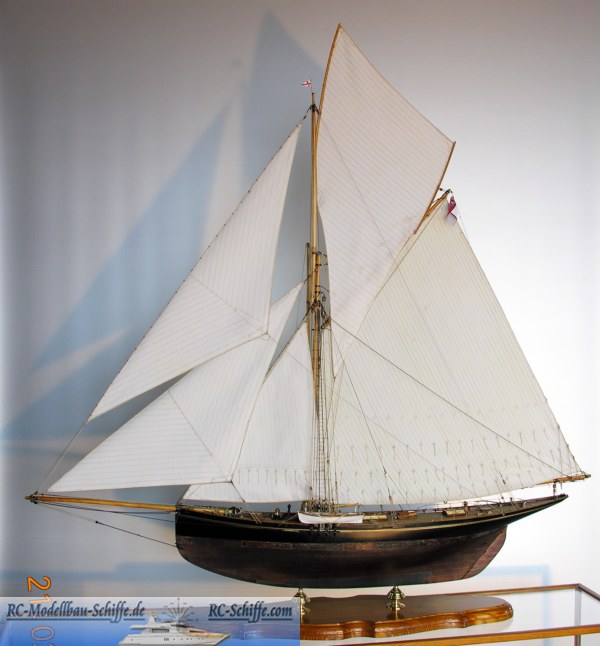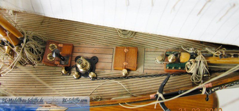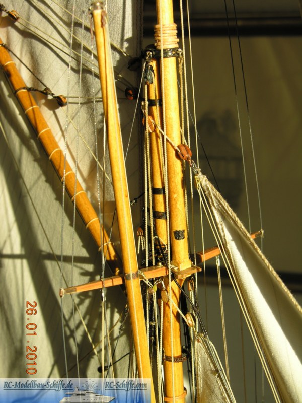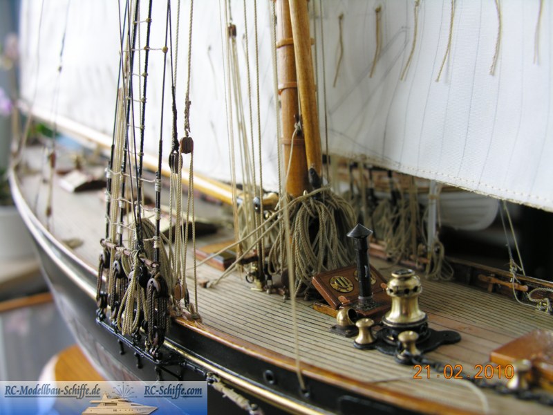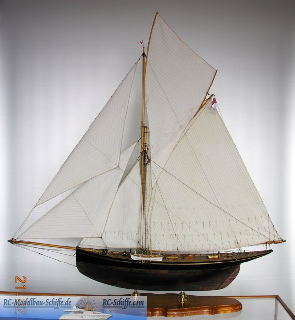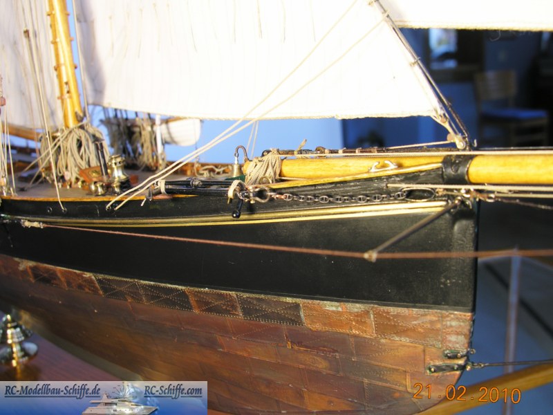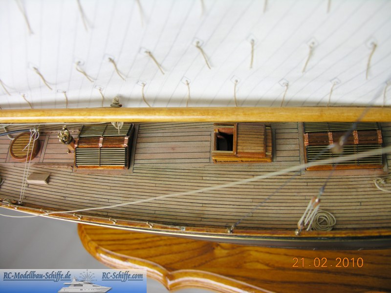 | Besonderheiten | Baubericht: Nachdem ich den Verteidiger des A.C. von 1885 „PURITAN“ nach einem Plan von Mamoli, der sehr bescheiden in den Details ist und einer umfangreichen Recherche, in 1:50 gebaut hatte, reizte mich der Bau des Herausforderers, des englischen Kutters „GENESTA“. Leichter gesagt als getan, denn ich fand weder in den Staaten noch in England irgend welche Pläne oder Unterlagen, USA lediglich ein paar Fotos. Es gibt, so viel ich weiß, nur ein Modell im New York Yacht Club, leider nicht zu fotogra- fieren. Durch Zufall fand ich in Falmouth-Cornwall ein Buch über das Yachtwesen in den von William P. Stephens, „Tradition & Memories of American Yachting“, dort fand ich den Linienriß und einen Querschnitt mit den Decks- aufbauten, auch die Maße des Riggs. Damit hatte ich genug Information um eine identisches Modell in 1:50 zu bauen. Den Rumpf baute ich mit 2x5mm Kiefernleisten auf Sperrholzspanten, innen mit Epoxyd fixiert. Den Rumpf als Finish mit Srayspachtel einsprühen und naß schleifen. Englische Holzyachten waren damals noch mit Kupfer beschla- gen ( amerikanische wurden mit einer Blei-Graphitmischung eingerieben ), also besorgte ich mir Kupfertape und schnitt daraus die vielen Platten. Für die Darstellung der Nägel, baute ich aus einem feinen Uhrenzahnrad eine Rändelvorrichtung. Nach dem aufkleben (man fängt unten an), mit Aceton reinigen und, wenn man will, mit einem Brünniermittel beizen, sieht mei- ner Meinung nach lebendiger, echter aus. Fürs Deck nahm ich 1.5 x 1.5mm helle Nussbaumleisten, als Kalfaterung eignet sich sehr gut Elektrikertape. Das Deckslayout entnahm ich der Zeichnung und von Fotos. Das Rig ist ein Cutter Rigg, soweit kein Geheimnis. Allerdings sollte man berücksichtigen, daß auf den Racern der Zeit grundsätzlich während der Segelei die Stenge gefiert werden konnte (der Grund für den Sieg der PURITAN), also sollte man das Stengewindrep eingeschert haben und berücksichtigen, daß die Stenge- wanten und das Stengestag nach dem Fieren der Stenge durchgesetzt werden können, das Gleiche gilt auch für den Bugsprit und sein Geschirr, der während der Fahrt rein und raus gefahren werden konnte. Für die Vorsegel kann man auch je ein Fall mehr anbringen, da ja ständig Segel gewechselt wurden. Für den Mast, Bäume und Spieren ist Linde ein feines Holz, keine Äste, kaum Maserung, gut zu beizen. Alle Beschläge an Deck und Rigg aus Messing , Blöcke individuell aus Birne gefertigt, Segel aus sehr feiner Baumwolle mit stark verdünnter Akrylfarbe gefärbt, mit Bleistift die Bahnen aufgezeichnet und mit Lieken versehen. GENESTA ist eine typisch englische „plank on edge“ Yacht, also extrem schmal und sehr tief (LaD 29,5 x B 4,5 x T 4,2 ) gezeichnet von J. Beavor Webb 1885. Für einen geübten Modellsegler könnte dieses Schiff doch einen Reiz haben. |