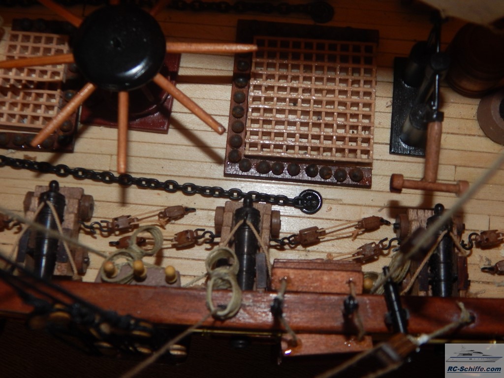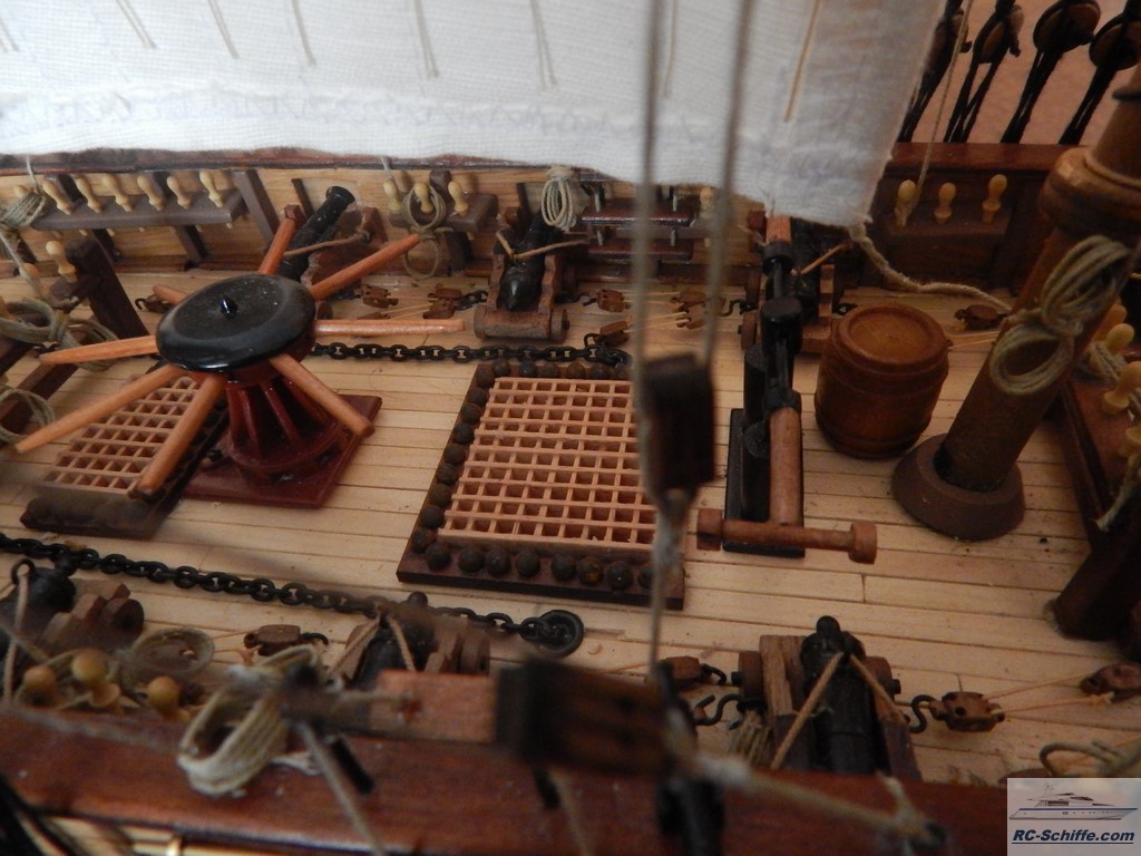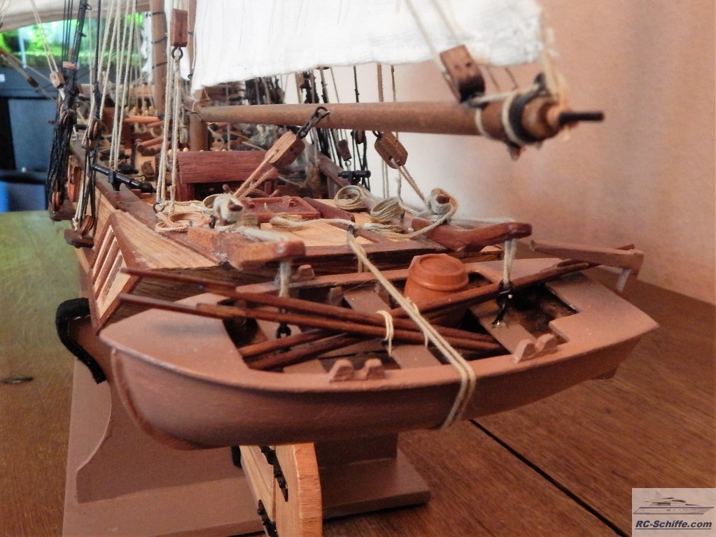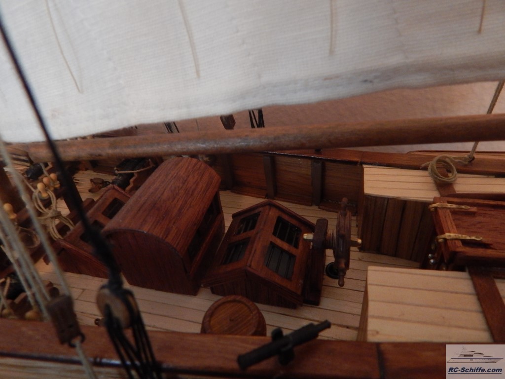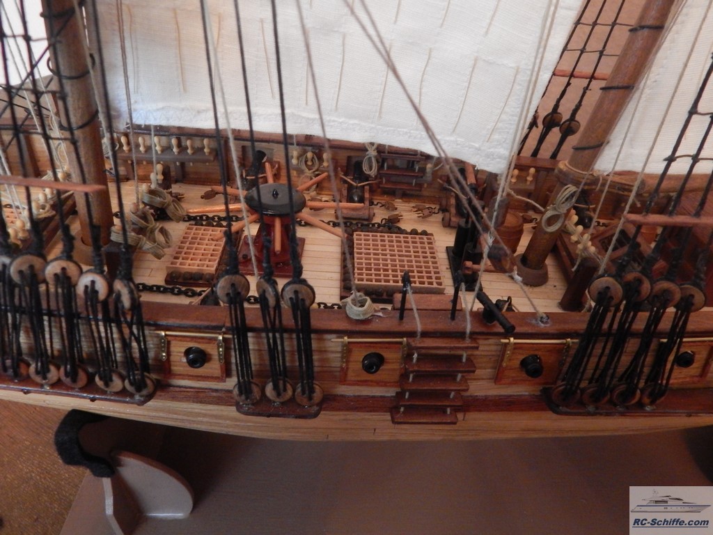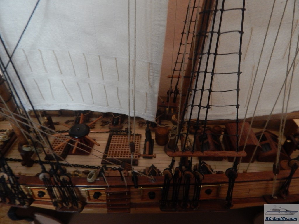 Dieses Modell ist ein französischer Zweimast-Toppsegelschoner von 1823. Das Schiff nahm im Krieg gegen Spanien teil. Es ist das für mich erste Modell dieser Art und voraussichtlich auch das letzte. Ich habe ca. 8 Monate an diesem Modell gearbeitet. Alleine für die Bespannung habe ich für "stehendes Gut" ca. 80 m schwarzes Takelgarn und für "laufendes "Gut" ca. 120 m helles Takelgarn verwendet. Die Segel hat meine Frau genäht. |