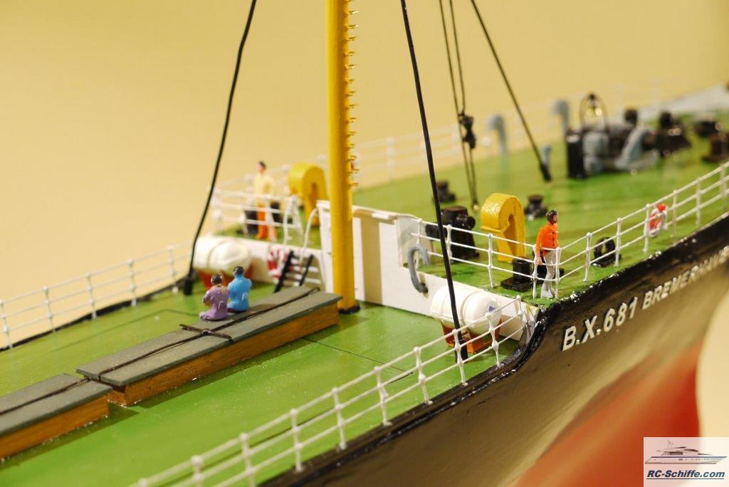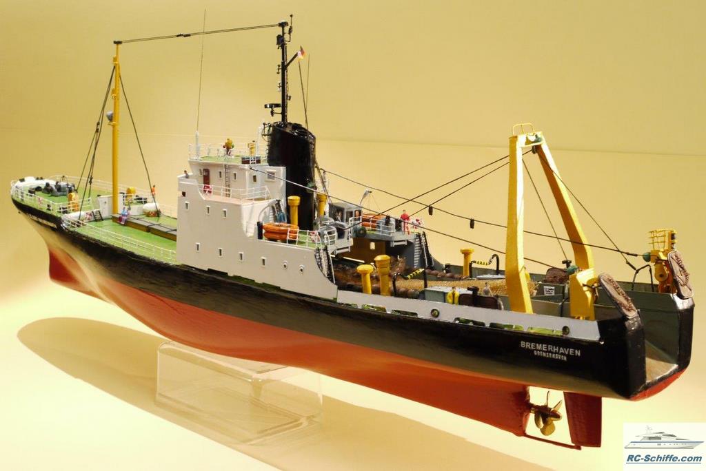 Als alter Bremerhavener dachte ich, es wäre schön ein Schiff mit dem Namen meiner Heimatstadt zu bauen. Nach anfänglichen Ängsten einen Rumpf vollständig selber zu bauen (Spanten aussägen, beplanken mit Balsa, dann GFK außen und innen) habe ich festgestellt; Nichts ist unmöglich! Deck ist auch aus GFK. Die Aufbauten sind aus Polystyrol-Platten. Ich hoffe, dass ich mit diesem kurzen Bericht und den Bildern wieder ein klein wenig für die Vermittlung des Spaßes für unser Hobby beigetragen habe. |