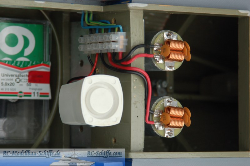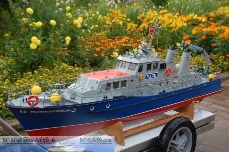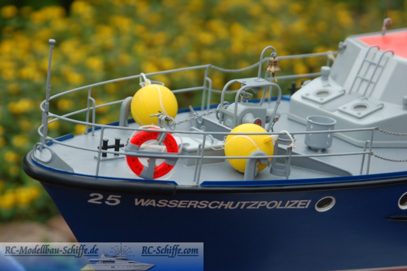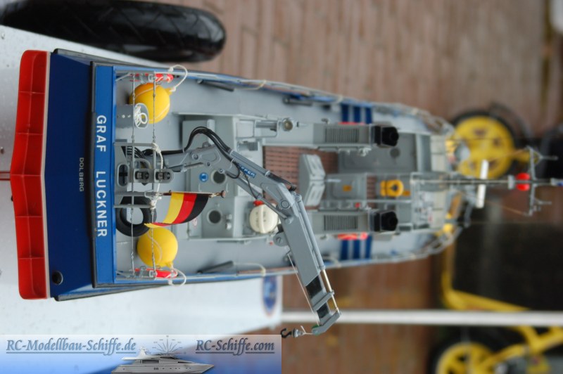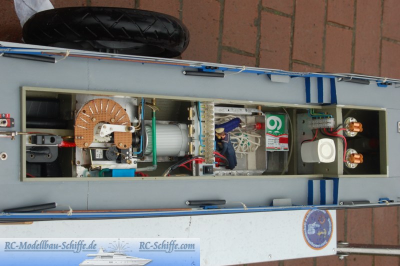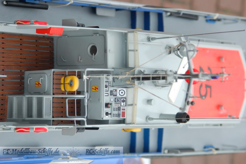 | Besonderheiten | Alle Türen und Luken sind beweglich, unter einigen sind die Schalter versteckt, unter anderen dann die Verbindungssicherung zwischen Deck und Aufbau. Der Aufbau besteht komplett aus Aluminium! Radar, Sirene, Beleuchtung und ein Bugstrahlruder mit Pumpe und Düsen sind die nennenswerten Sonderfunktionen. Der Rumpf ist aus Holzspanten mit einer Beplankung aus 5x5er Kiefernleisten und anschließender Glasfaserbelegung. |
