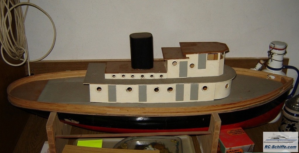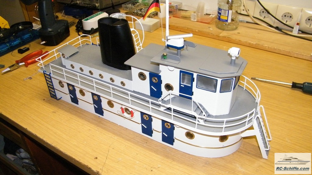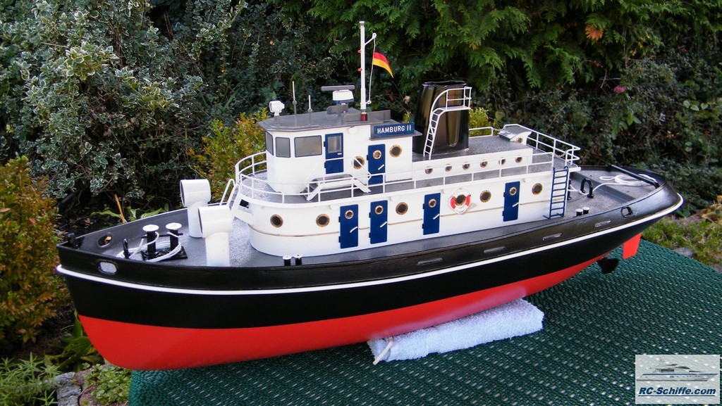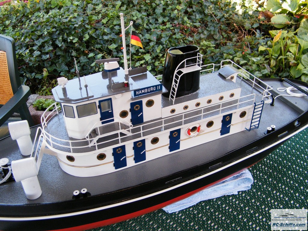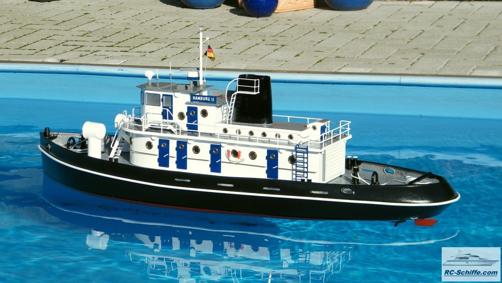 | Besonderheiten | Der Schlepper hat ein Leergewicht von 7,5 Kg. Mit den 2 Fahrakkus kommt er auf 12,2 Kg Wasserverdrängung. Angetrieben wird er mit einem starken Lüftermotor aus der Automobiltechnik und einer 60 mm Dreiblattschraube. Über einen 4 Kanal Multischalter kann die Innenbeleuchtung, Außenbeleuchtung, Toplicht und Positionlampen und einen Suchscheinwerfer geschaltet werden. |