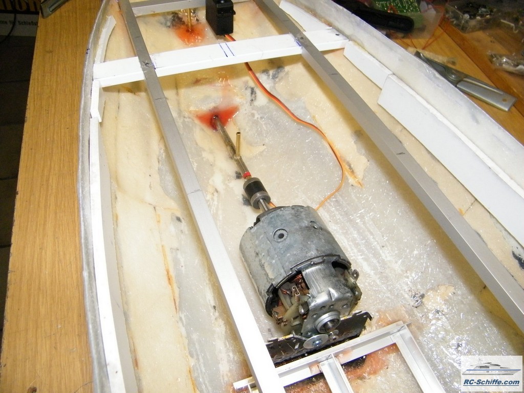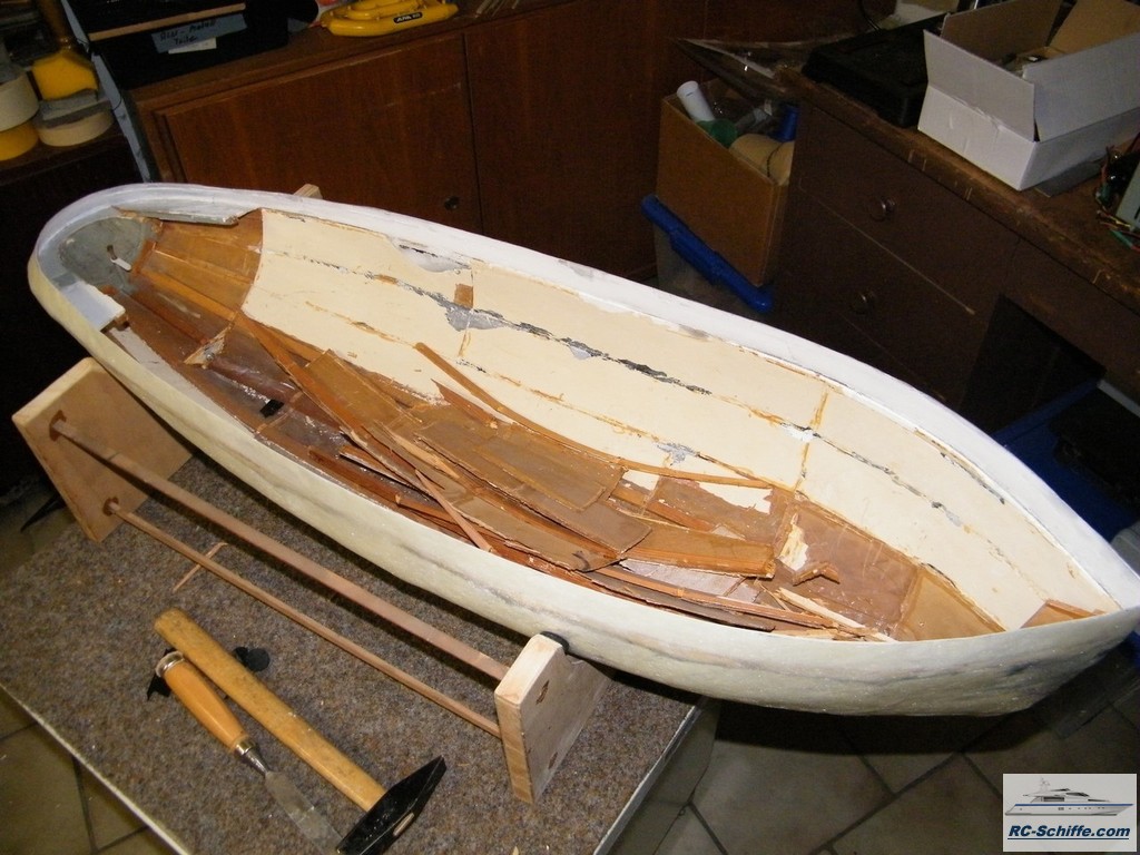 | Tipps für den Bau | Der Erstaufbau erfolgte in Spantenbauweise mit Beplankung, was recht zügig erledigt war.Die Heckrundung wurde aus einem Klotz Balsaholz zurechtgeraspelt. Danach war Spachteln und Schleifen in unzähligen Stunden angesagt. Nachdem der Rumpf geglättet war, kamen mehrere Lagen Lackfarbe darauf. Leider wartete dann das Boot in diesem Zustand über 40 Jahre im Keller oder auf dem Dachboden auf die jetzt erfogte Fertigstellung. Wer auch Interesse hat, dieses Modell zu bauen, kann sich mit mir in Verbindung setzten. Die gesamten originalen Baupläne sind noch vorhanden. |