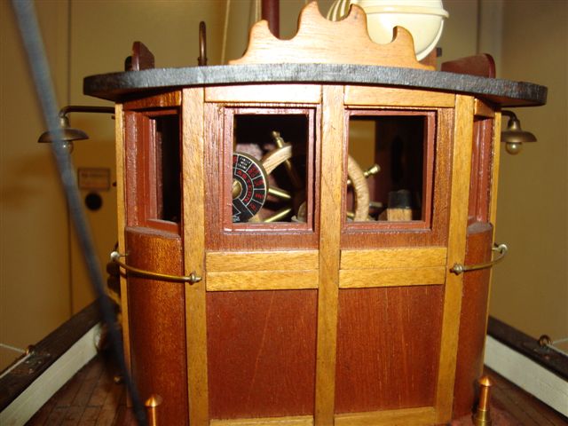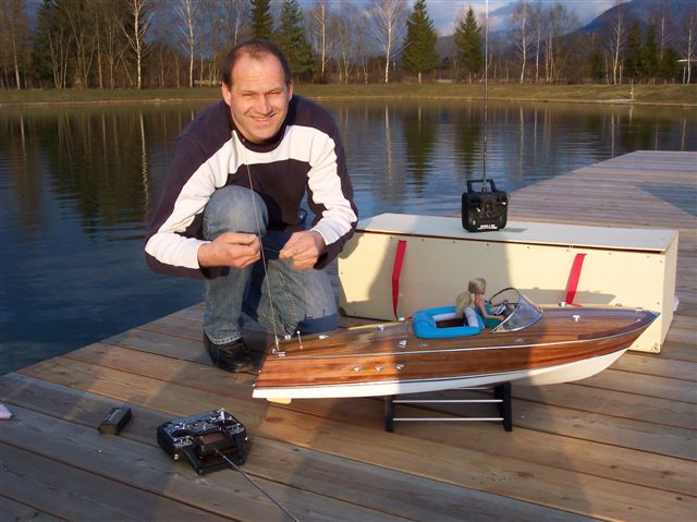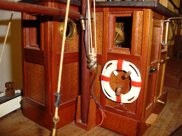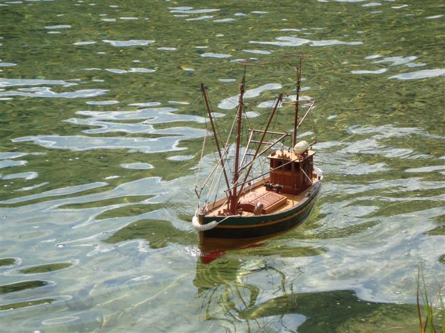 Klassische Spantenbauweise, Doppelbeplankung, alles Holz - auch das Ruder, Takellage mit Gummischnüren, Ausgebaues Steuerhaus mit Beleuchtung abnehmbar, Dieselgeräusch, Ladeluke abnehmbar |