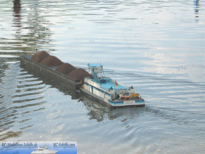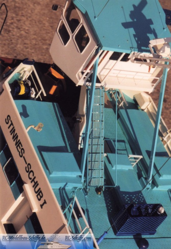 | Besonderheiten | ( Zusatzfunktionen)Gesteuert über 4 Schillingruder.Steuerstand wie beim Oringinal ölhydraulisch gehoben und gesenkt werden. Ebenso der Kran im Heck. Steuerstand und alle Kabinen sind wie beim Original einge- richtet. Die Beleuchtung kann jedem Einsatzzweck angepasst werden. Aus den Abgaskaminen kann per Fernsteuerung Rauch abgegeben werden. Das Original-Dieselgeräusch wird zusammen mit dem Nebelhorn erzeugt. |