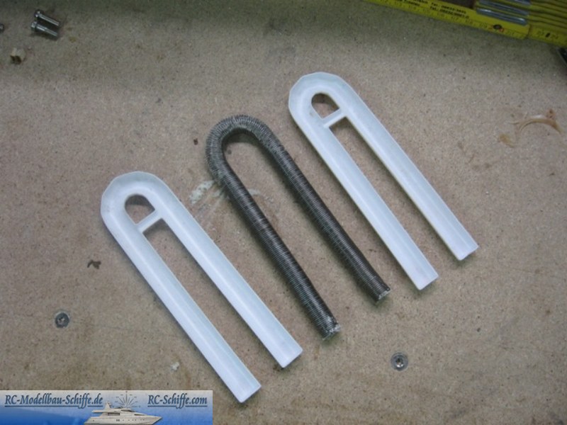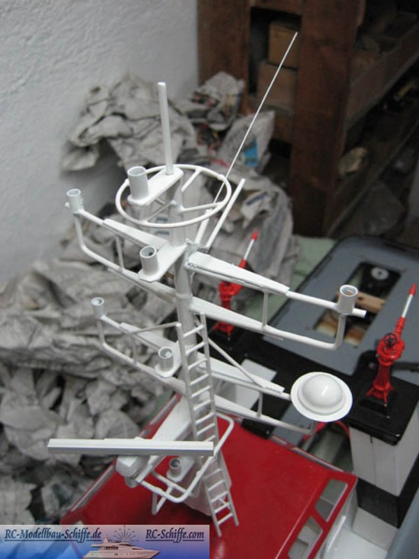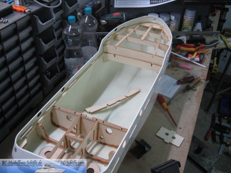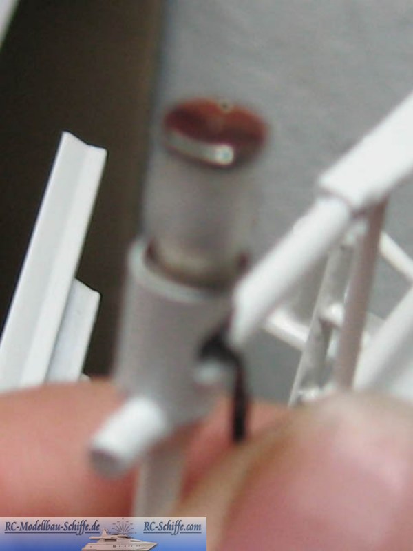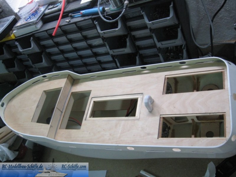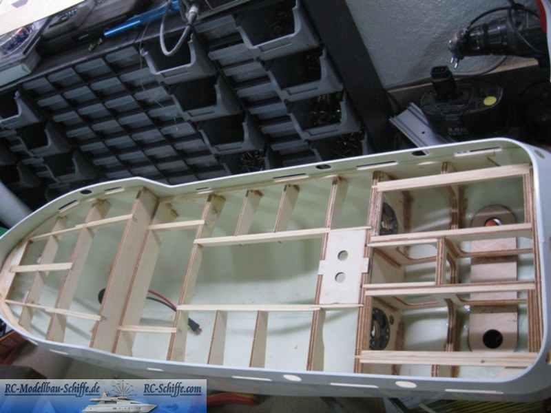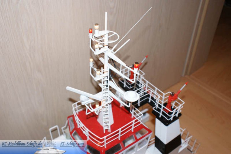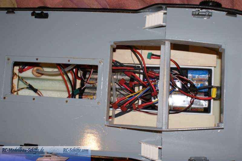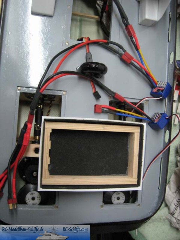 | Tipps für den Bau | Nur nach Technischem Bauplan arbeiten und alles gründlich durchlesen bevor man anfängt. Manches ist nicht erklärt und bedarf fundierter Modellbaukenntnisse. Geschick im Bau und im der Improvisation sind gefragt. Teile sind nicht immer passgenau und es empfiehlt sich, dass Deck mit einem Silikonkleber oder Heute auch mit Pattex Bombenfest oder Kraftkleber anzubringen, da dieser Kleber extrem fest und Wasserdicht ist. Mit einem 2 Komponentenkleber würde man viel zu lange brauchen und da wäre der erste Strang schon wieder fast fest ehe man das komplette Deck verkleben kann. Die Holzskelettkonstruktion im Rumpf muss nicht genau nach Bauplan erfolgen man kann da auch sehr frei arbeiten. Die Motoren habe ich mit der Mitgelieferten Alu Motorhalterung verbaut und die Motorhalterung fest mit dem Holz verklebt und verschraubt. Im Deck sind normalerweise 3 Öffnungen für Wartungsarbeiten. Diese sollten eigentlich verschraubt werden, das habe ich komplett anders gemacht. Ich habe die Öffnungen durch 1mm starkes Edelstahlblech ersetzt und habe einen Magnetverschluss angebracht. Starke Zylindermagnete im Deck für die kleinen Öffnungen jeweils 6 für die große 8. Starke Magnete auf dem Edelstahlblech verklebt und unter das Edelstahlblech eine Schicht Selbstklebendes Moosgummi. Tests haben ergeben, dass kaum Wasser ins innere kommt, bzw. garkein Wasser, aber Mossgummi saugt ein bisschen Wasser an. Keinerlei Beschädigungen im Rumpf kein Wassereintritt und zu 100% Wasserdicht! Schnelles Öffnen der Schächte ist hier möglich normal müsste jedesmal geschraubt werden... Für den Masten habe ich eine Spezialkonstruktion gemacht und die Lämpchen nicht auf die Stangen aufgeklebt sondern den unteren Teil der Lampe mit einem Alurörchen verklebt und dieses ist fest verlötet auf dem Mast. Ein kleines Loch im Alurohr sorgt dafür, dass man das Kabel der Lampe durchführen kann. Die verschiedenen Ebenen des Deckaufbaus habe ich nicht verspachtelt sondern mit Acrylmasse verklebt und die Ränder mit Spüli entfernt Acrylfugen sind eben auch überlackierbar. Lack ist komplett Wasserbasierend von Dupli Color. min. 2 Schichten Farbe und am kompletten Rumpf außen 4 Schichten Klarlack. Ein Bild vom fertigen Schiff wird nachgereicht, sobald ich dazu komme die restlichen Details noch abzuarbeiten! |