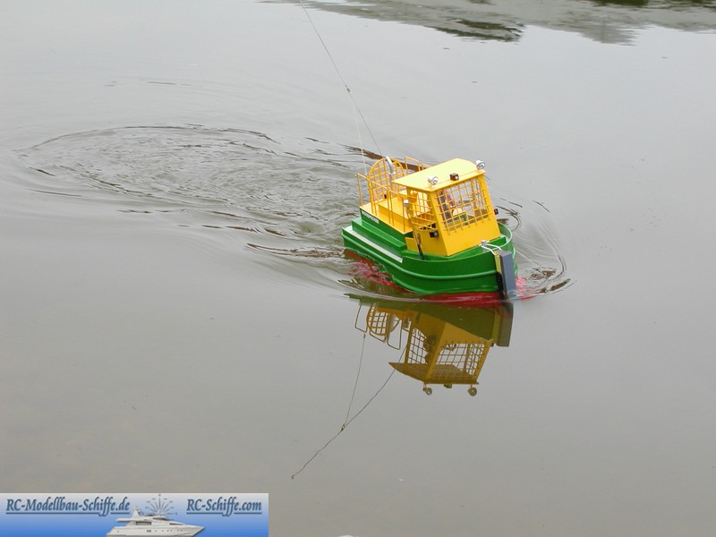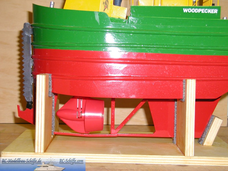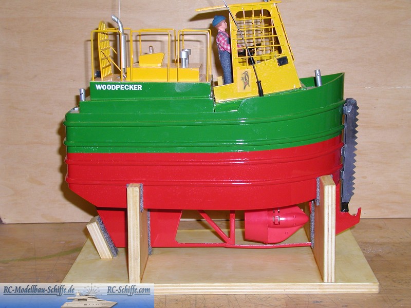 | Besonderheiten | Der E-Motor treibt über einen Zahnriemen einen Graupner Rotorprop an, welcher 240 Grad Drehbar ist und dem Modell eine gute Manöverierbarkeit gibt. Befeuerung und Scheinwerfer können zugeschaltet werden. Die Fenster sind mit Gitter gegen Holzsplitter und Aeste geschützt. Im Bug eine Doppelstange mit Zähnen um die Holzstämme sicher zu halten. |