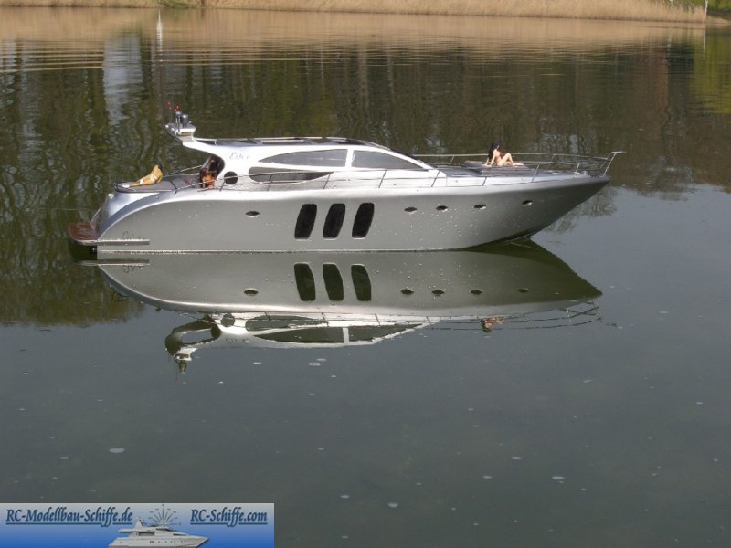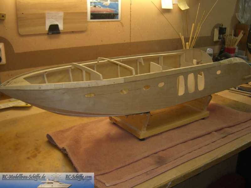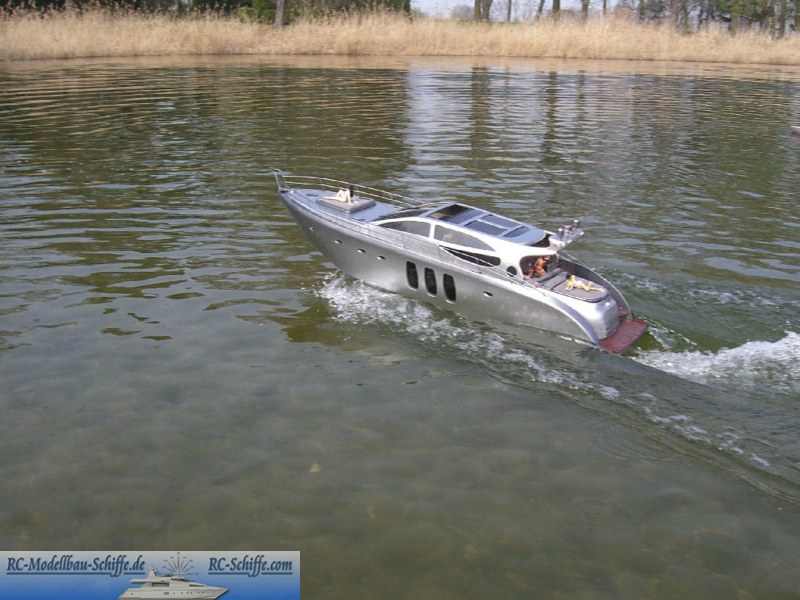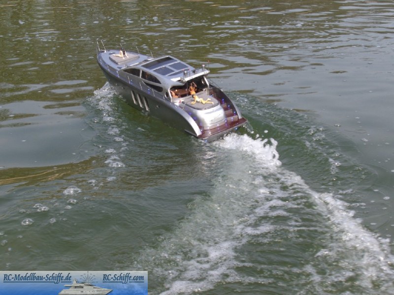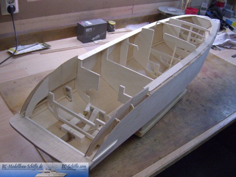 | Tipps für den Bau | Das Modell wurde nach dem Bauplan der WS60 von Philippe Hof gebaut. Es wurden einige Änderungen vorgenommen, wie z.B. die großen Bullaugen. Beplankt wurde der Rumpf mit 1,5 mm Flugzeugsperrholz, was eine große Stabilität brachte. Die Motoren treiben zwei 45er Dreiblatt Propeller an und haben damit kein Probleme. Nach 45 min. Fahrzeit sind die Regler handwarm, die Motore und der Lipo kalt. Sehr wichtig ist, dass die Heckpartie unter der Beibootgarage vollkommen abgedichtet ist, da das Heck sehr tief liegt und dadurch leicht Wasser in den Rumpf gelangen könnte. Die Crew besteht aus vier Herren und sechs Damen. |