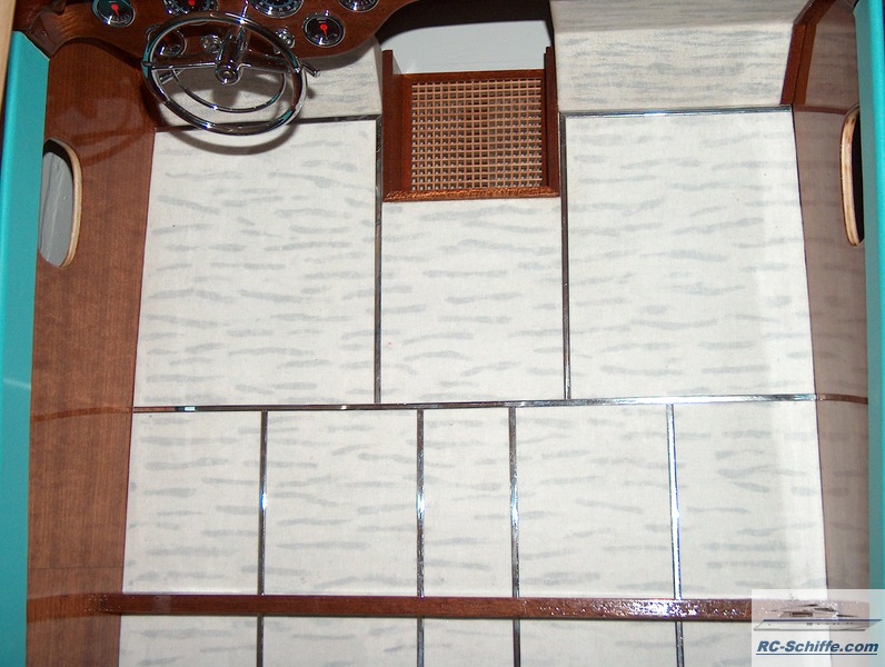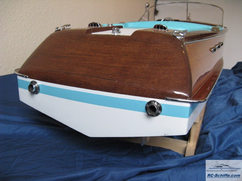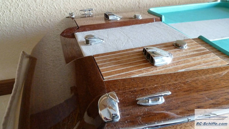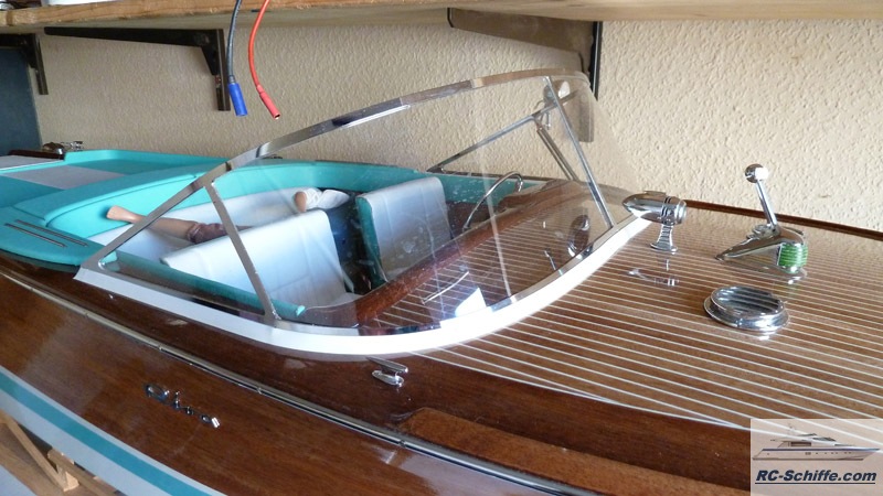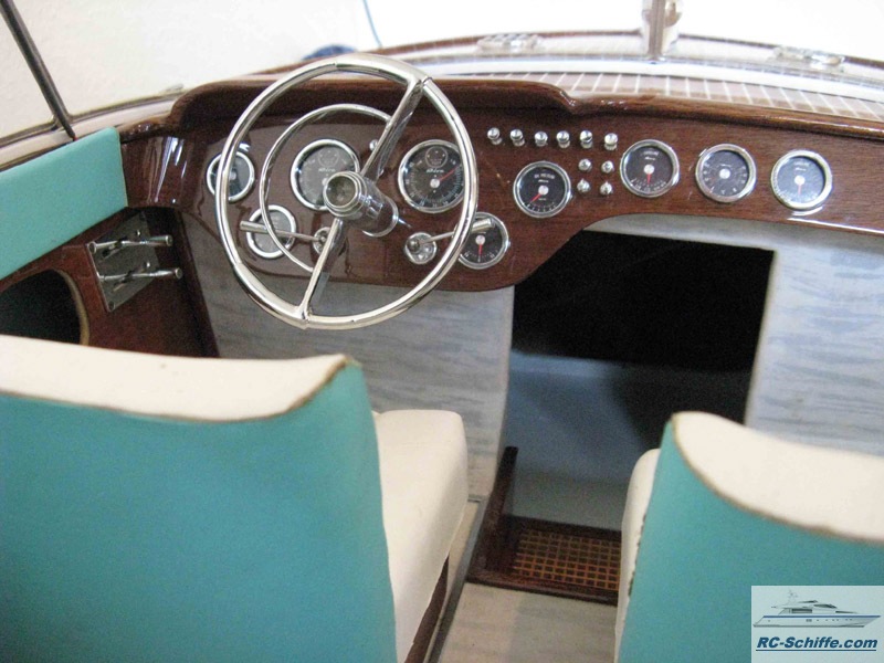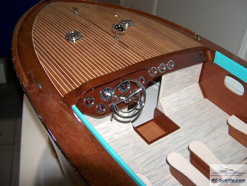 | Besonderheiten | Soundmodul für orginalen Riva-Sound, also das Starten beider Motoren und dann fahrgeschwindigkeitsabhänig. Beleuchtete Bug und Suchscheinwerfer und Hecklicht. Rumpf und Deck sind komplett aus Mahagoni. Der Rumpf ist ohne Unterbeplankung. Alle Teile sind mit Leder und Kunstleder bezogen. Der Frontscheibenrahmen ist aus 2mm Messing lasergeschnitten mit ausge- frästen Scheiben ausschnitten, dadurch liegen die Scheiben ohne Überstand in dem Rahmen. |