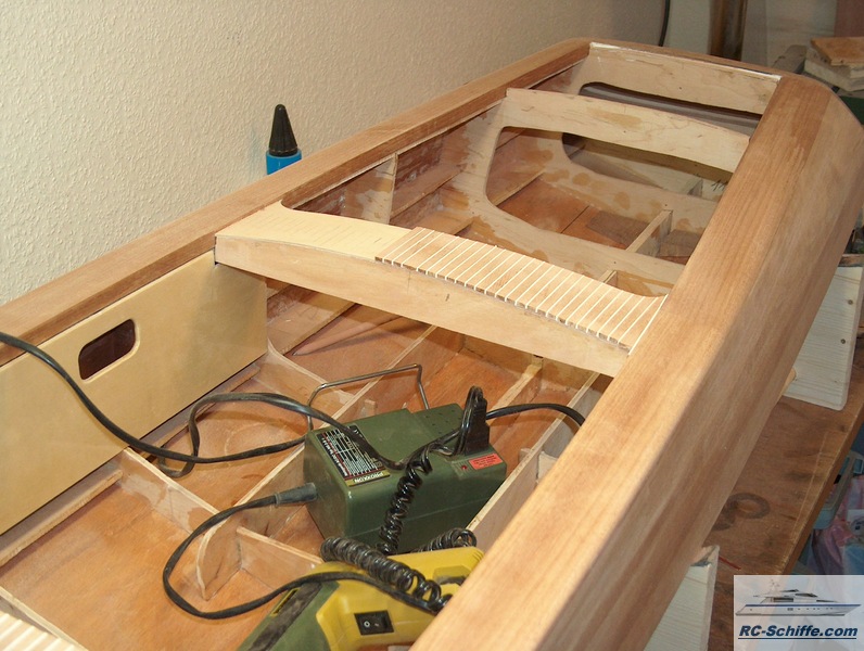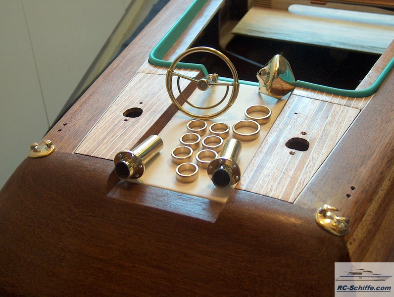 | Tipps für den Bau | Solche Modelle sollte man immer elektrisch antreiben. Die Verbrennergeräusche sind für dieses Modell nicht so toll. Hinzu kommt, dass dieses Boot überall fahren darf und rückwert kann es auch fahren. Den Rumpf würde ich nur noch mit Unterbeplankung aus Fliegersperrholz und Mahagonileisten 3x7mm beplanken. Bei der vorgestellte Riva habe ich Mahagonileisten 5x10mm verwendet, was enorme Probleme durch die Stärke mit sich brachte. Weiterhin habe ich für Teile, wie Hutzen, Klampen, Such- und Bugscheinwerfer Teile von BAE verbaut, so das Gußteile immer exakt gleich sind. Eine kleine Dreh und Fräsmaschine und Hartlötgeräte waren Grundvoraussetzungen. |