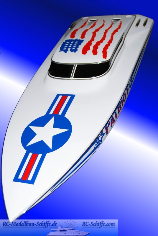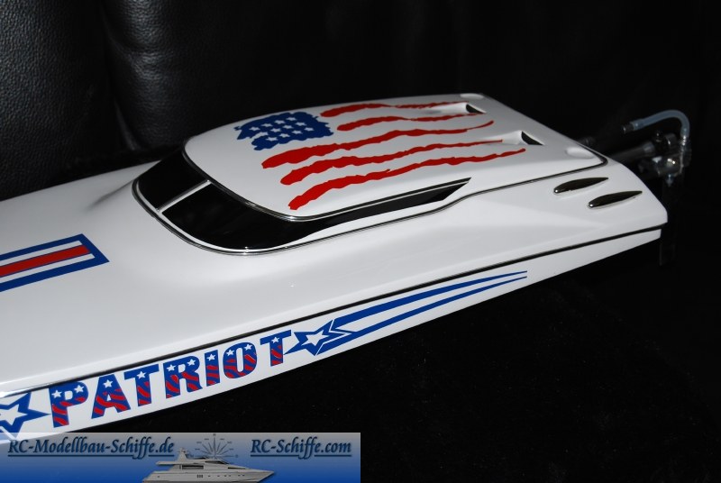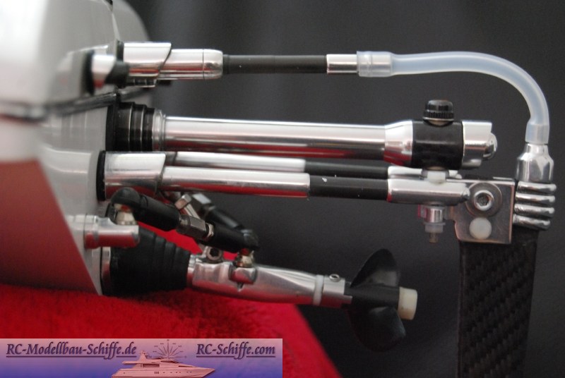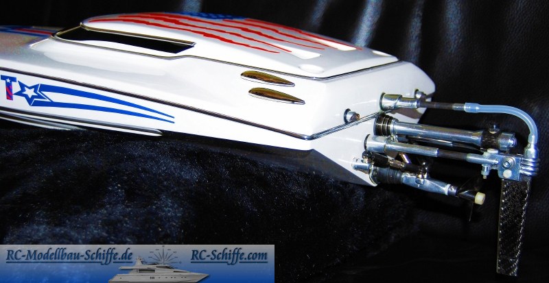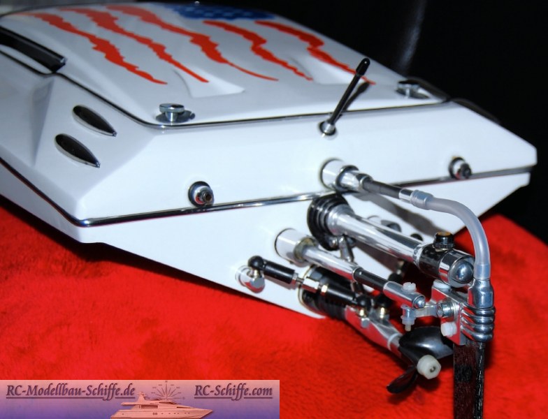 | Besonderheiten | Rumpf habe ich Importiert, wird in Deutschalnd oder EU nicht angeboten. Die Hardware ist komplett selbst entworfen und gebaut. Ich wollte mal was anderes machen und so habe ich einen runden Ruderausleger gebaut. Den Trimax Antrieb habe ich ( komplett) nachgebaut, da mir das Orig. nicht zusagte. Der Trimax hat 4x Edelstahlkugellager, ein Edelstahlwellenendstück und einen größeren Verstellbreich als das Orig. Ferner habe ich etwas festeres Aluminium verwendet, als das im Orig. der Fall ist. Anlenkung ist aus CFK und Alu, sowie Edelstahlseilen, das Runderblatt aus CFK. Der Deckel wird mit 2 Rändelschrauben und einer "Nase" vorn im Deckel befestigt. Duch die Form des Deckels kann man das Boot nicht abkleben wie es in EU üblich ist. Ist aber auch so dicht. Das Boot ist ein bischen Schönschiffchen mit etwas Rennboot gemixt. |